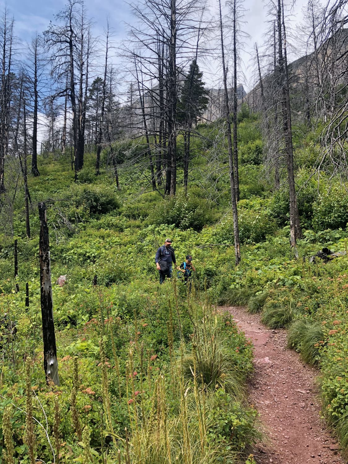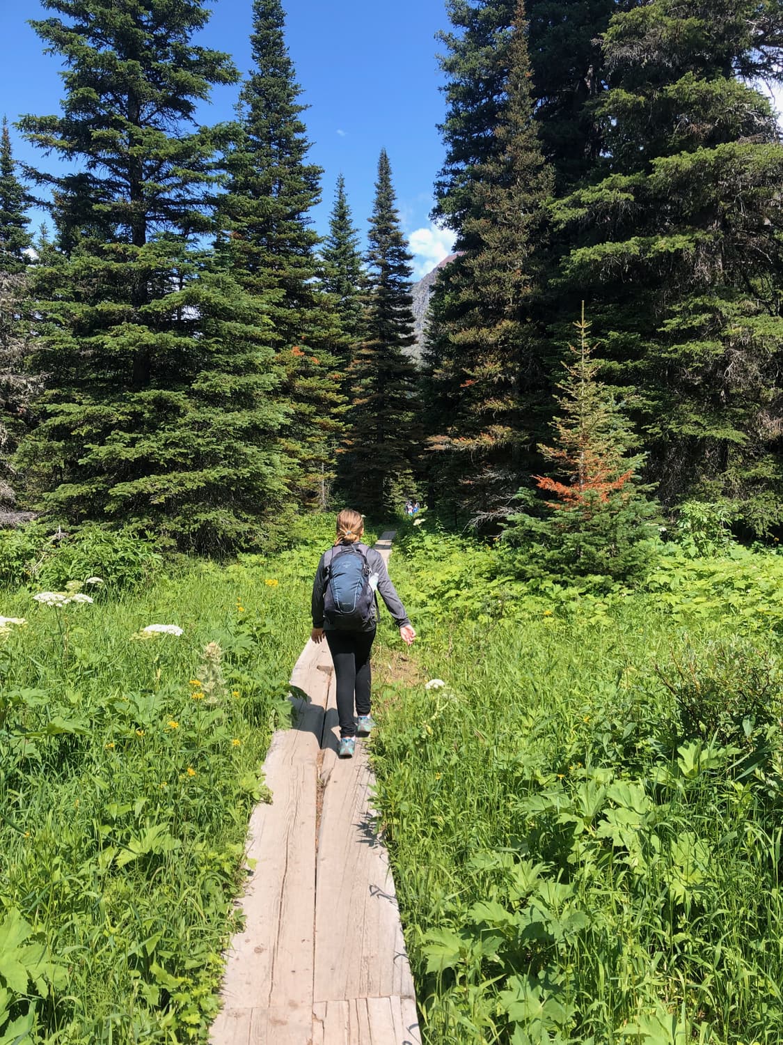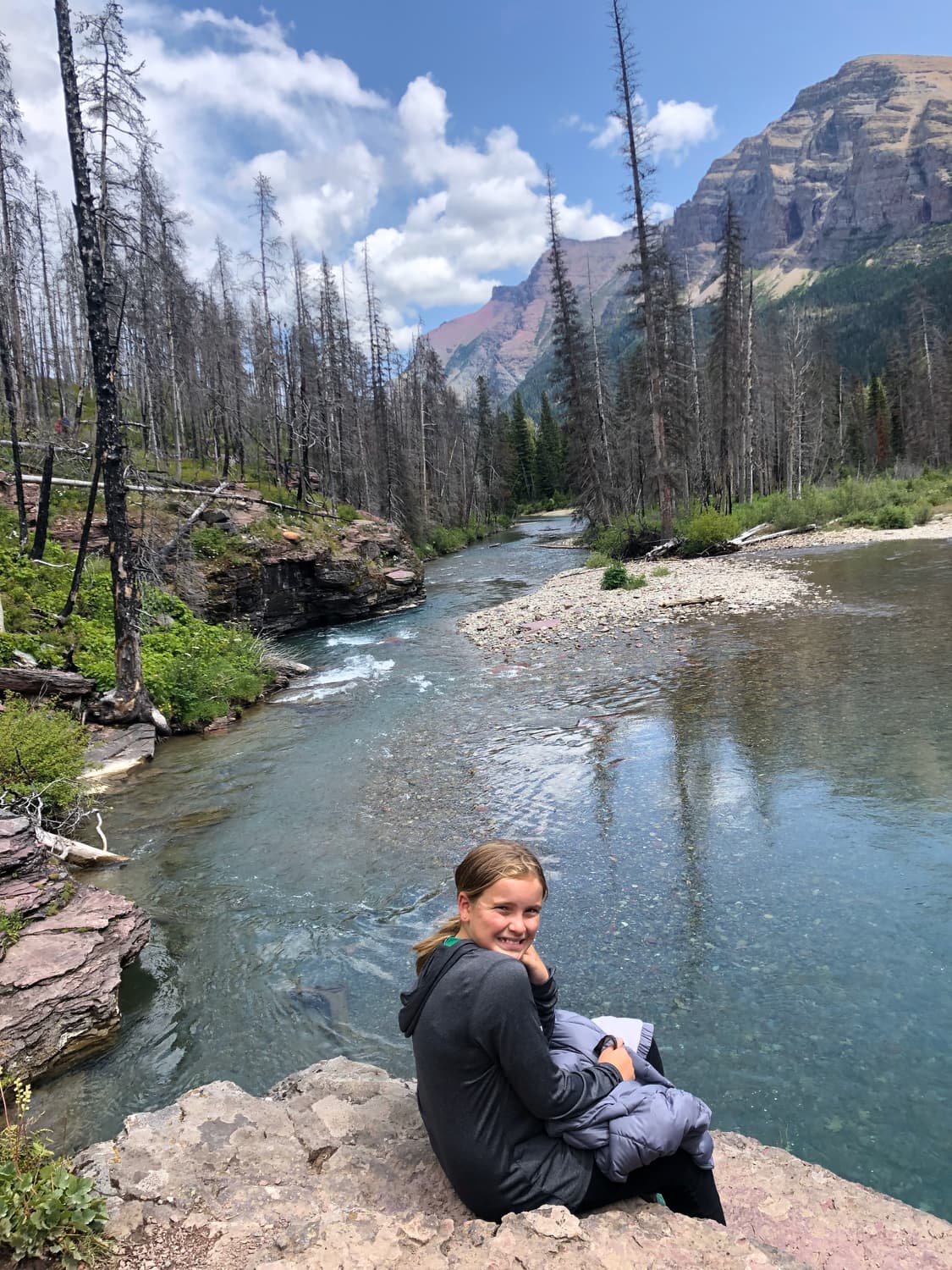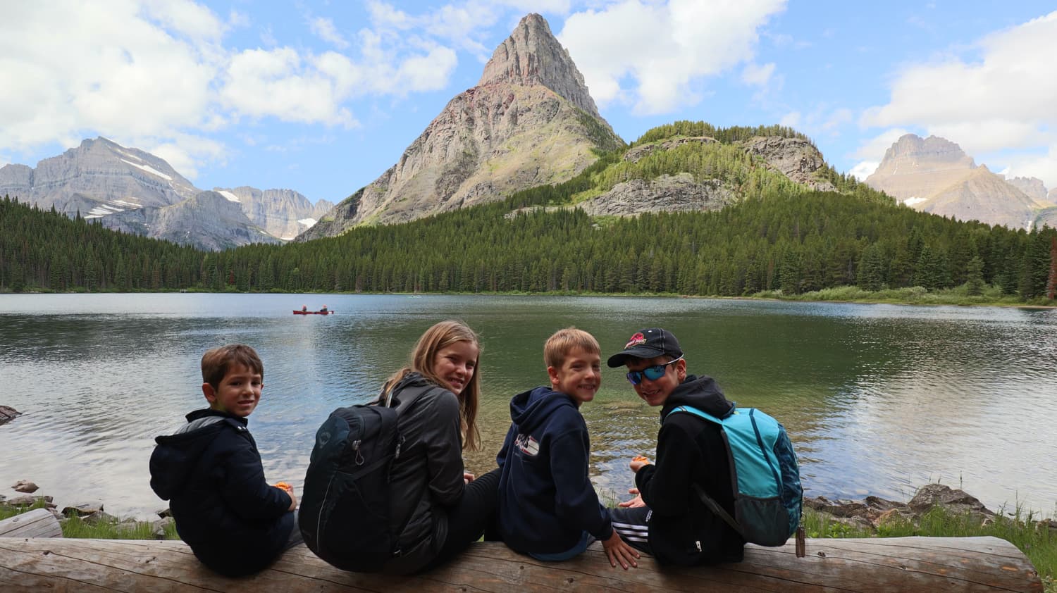 Arriving at Grinnell Lake, we had the most beautiful views of Grinnell Lake, with the Glacier in full view in the background. We rested in the sun, ate a picnic lunch, and the kids even fashioned makeshift “boats” out of tree bark. It was absolute heaven.