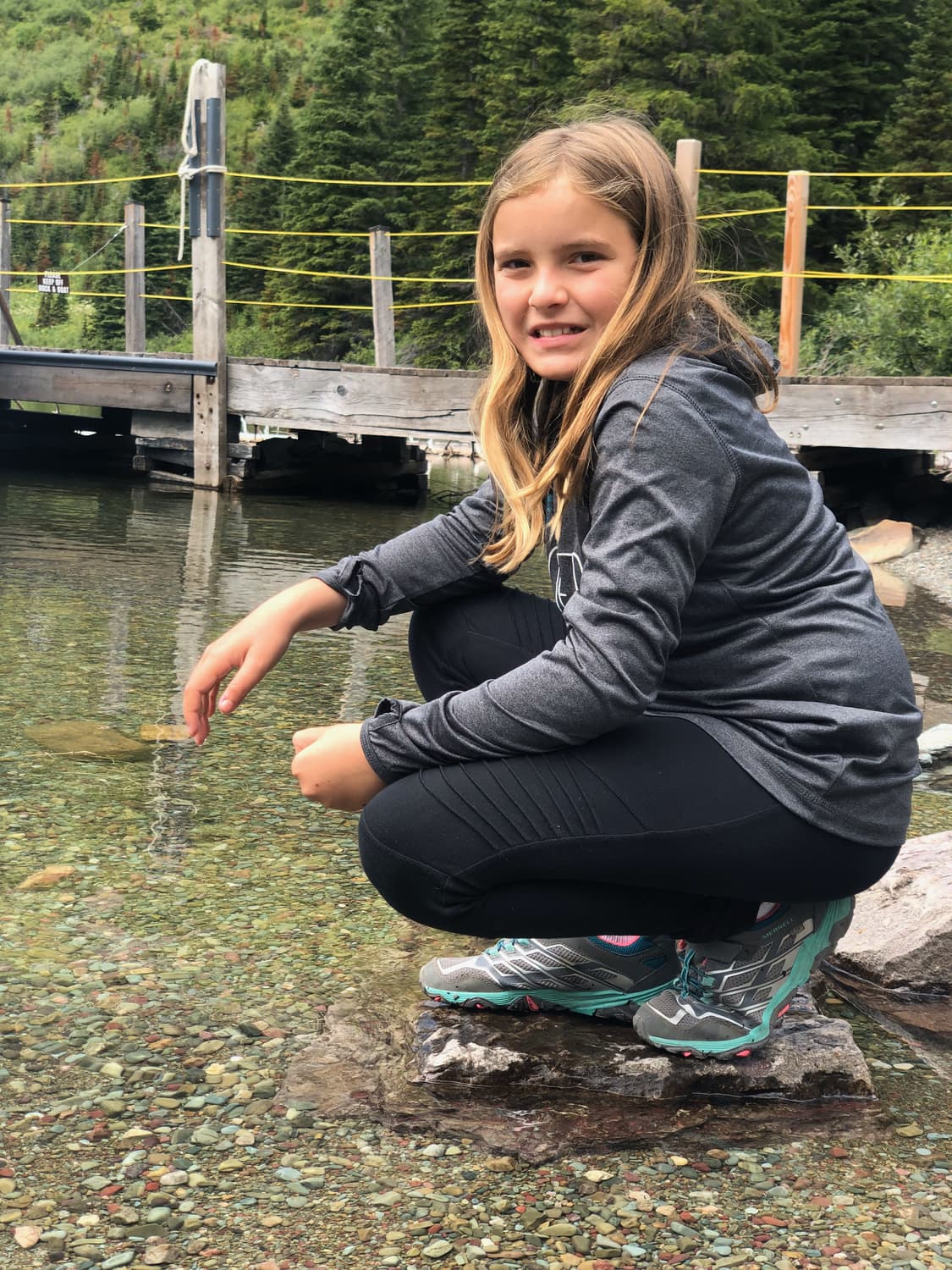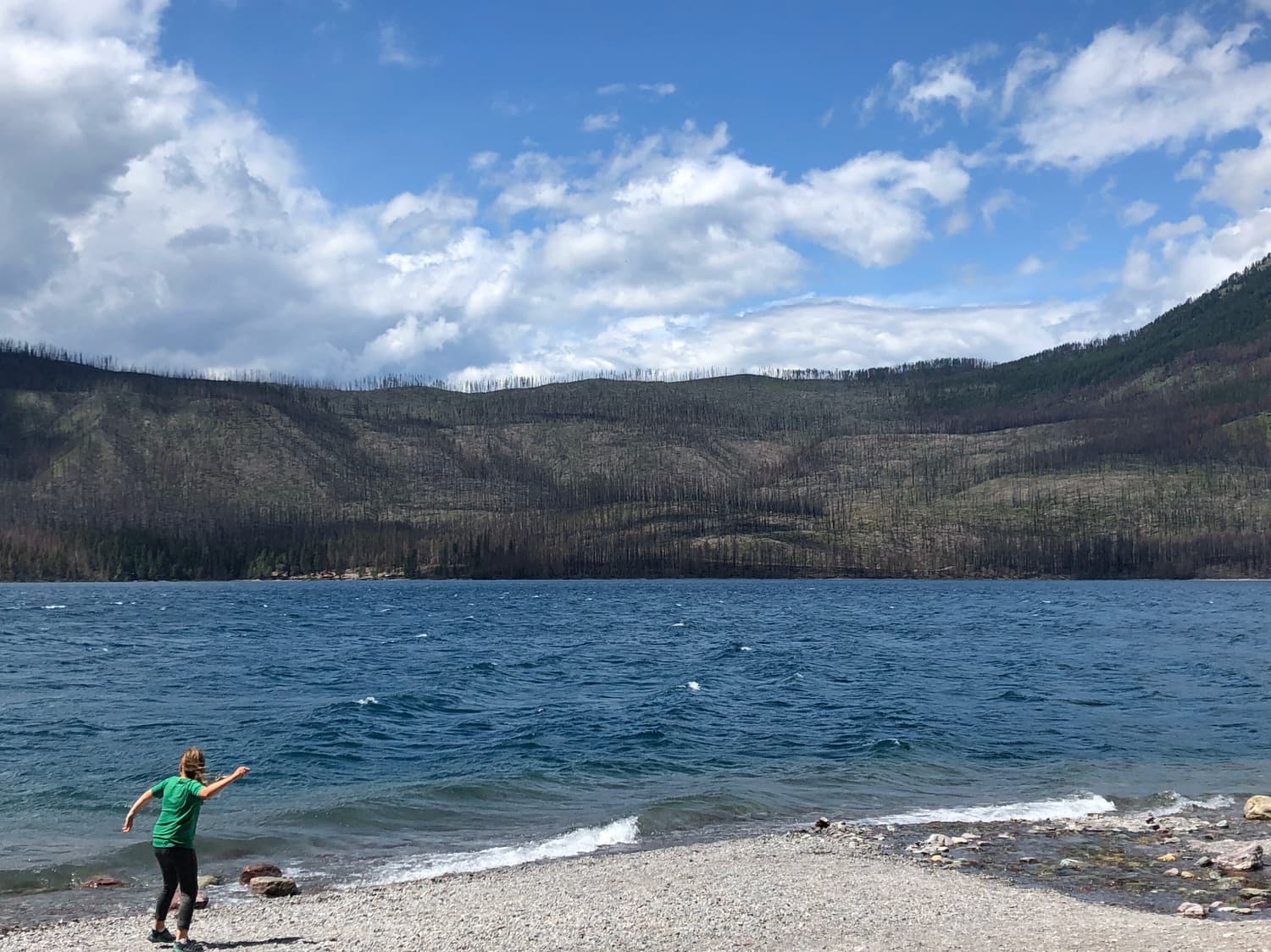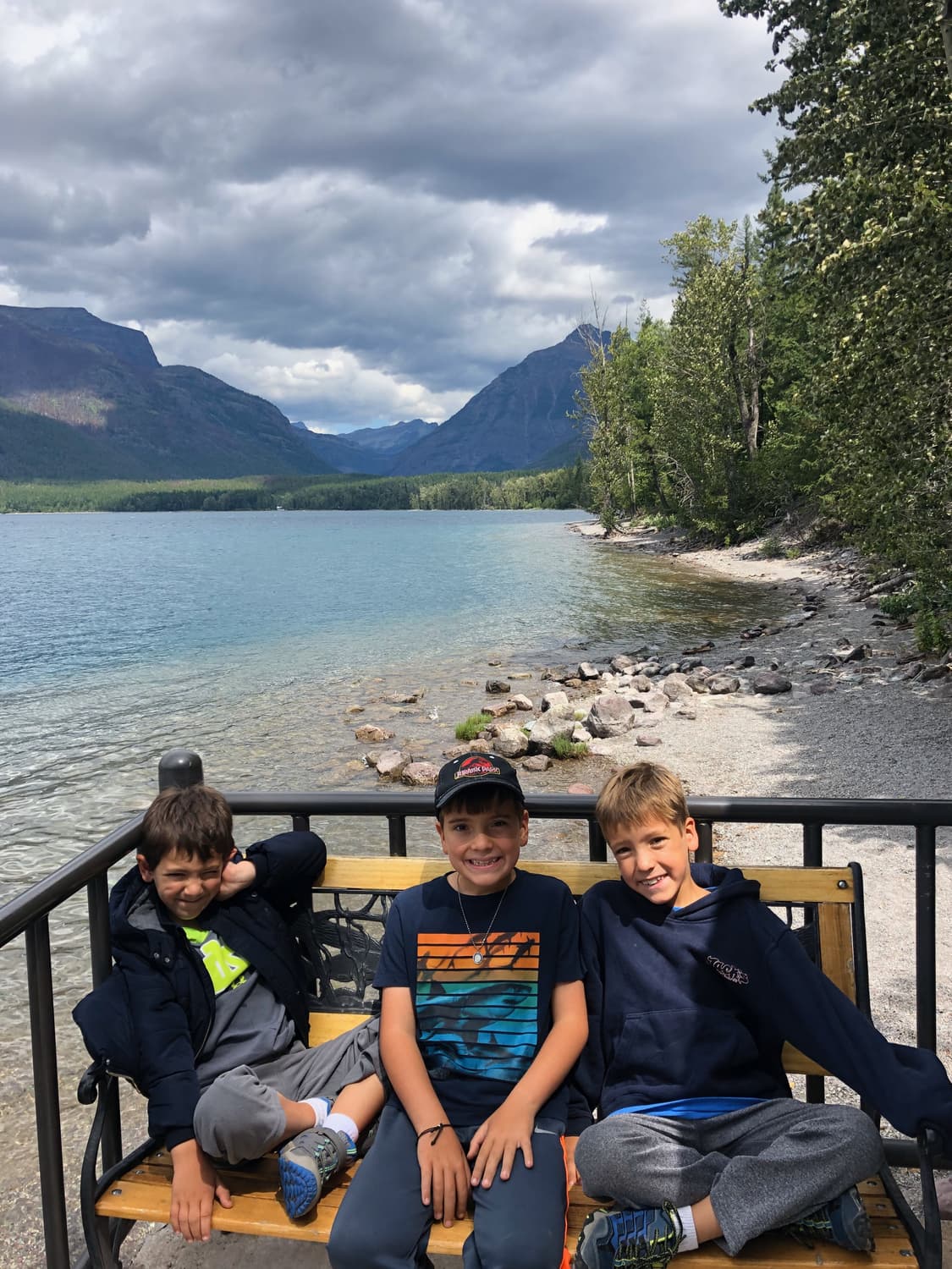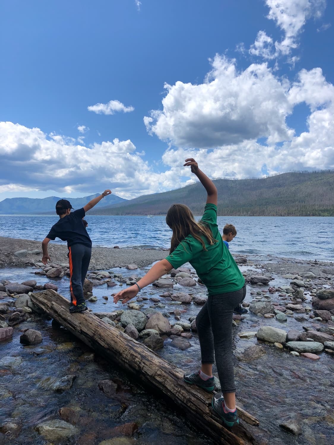 Along our journey, we stopped frequently, as each vista was surprisingly and seemingly more gorgeous than the previous. We spent some time along MacDonald River. and then finished our drive at Lake MacDonald, where we visited the historic Lake McDonald Lodge, and had a blast skipping rocks on the lake. Each of the kids submerged their feet in the river at least once, entirely soaking their hiking shoes, which Justin would spend the next morning drying with a blow dryer.
