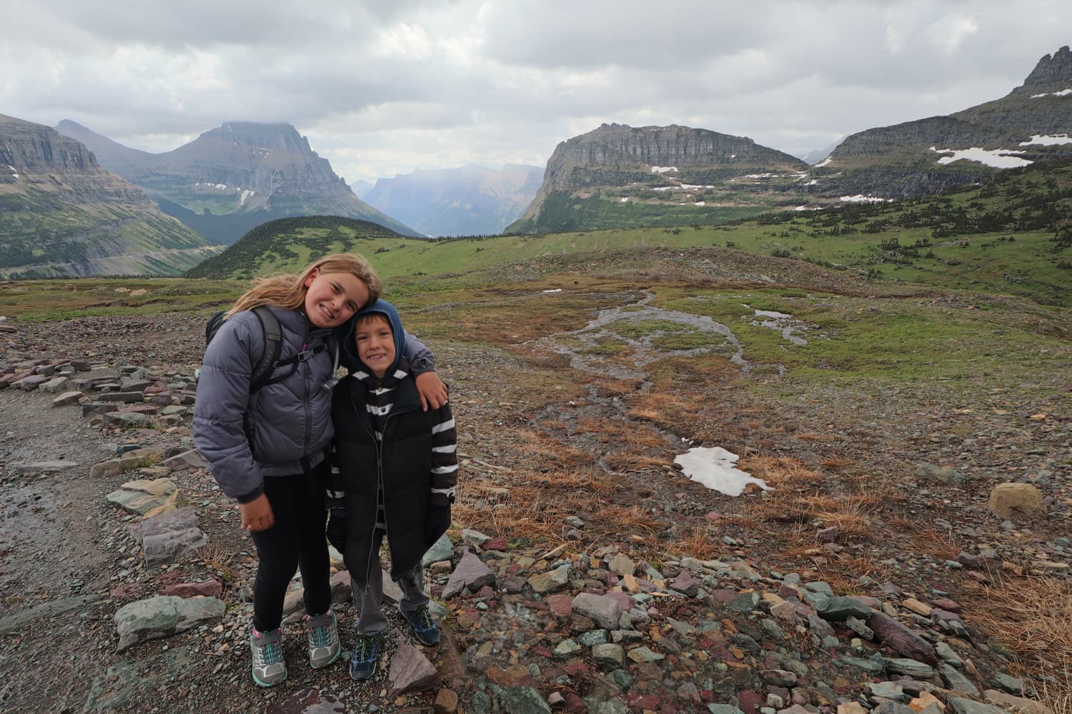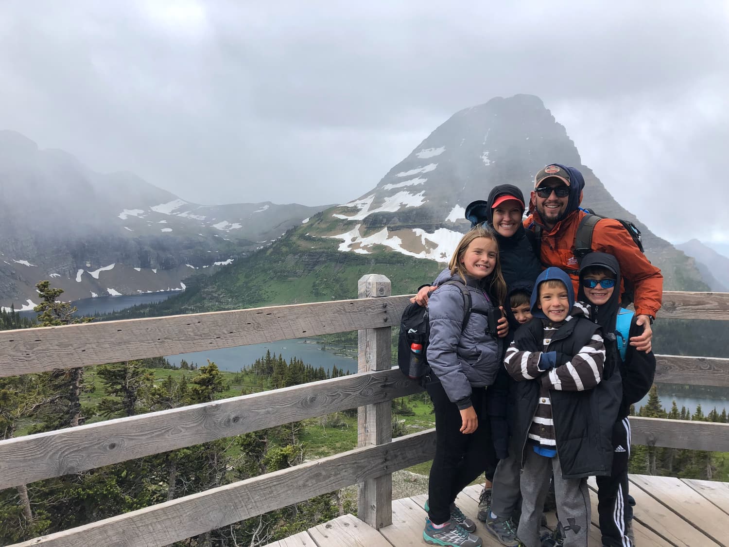 It was cold on our hike, and by the time we were a few minutes from the summit, we could tell that the massive storm cloud that had been looming on the horizon was close on our heels. Just as we reached the summit, it started SNOWING on us. We quickly checked out the view of Hidden Lake, snapped a few pics, and then made our way down as fast as our little legs could carry us. The kids got a kick out of the fact that it was snowing