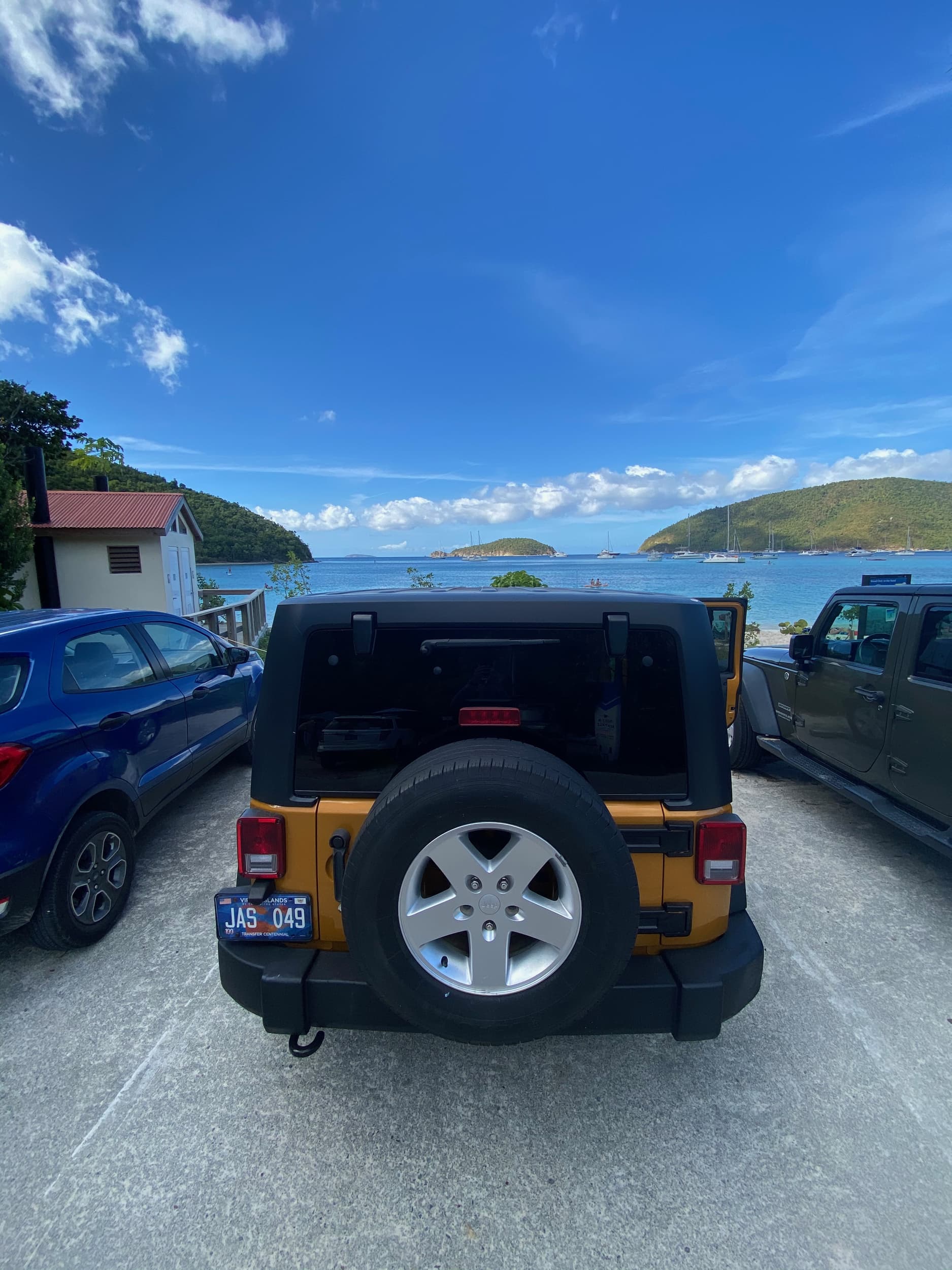 The ferry ride from St. Thomas to St. John was a quick 20 minutes, and we arrived in Cruz Bay, St. John, where we walked to pick up our Jeep rental for our stay. As they brought the car out for us, we were elated to see that it was a BRIGHT GOLD JEEP. We all swooned.