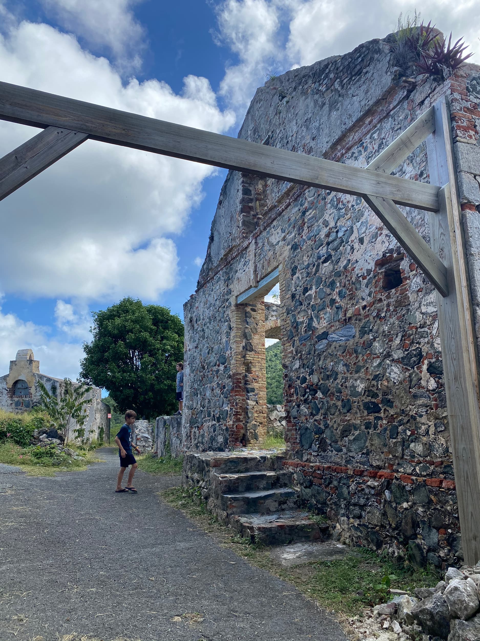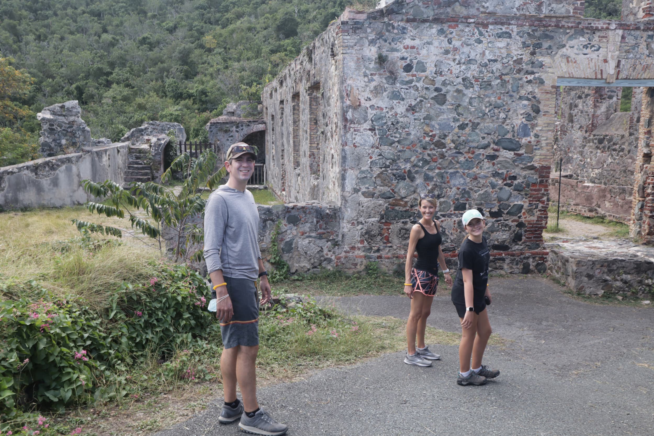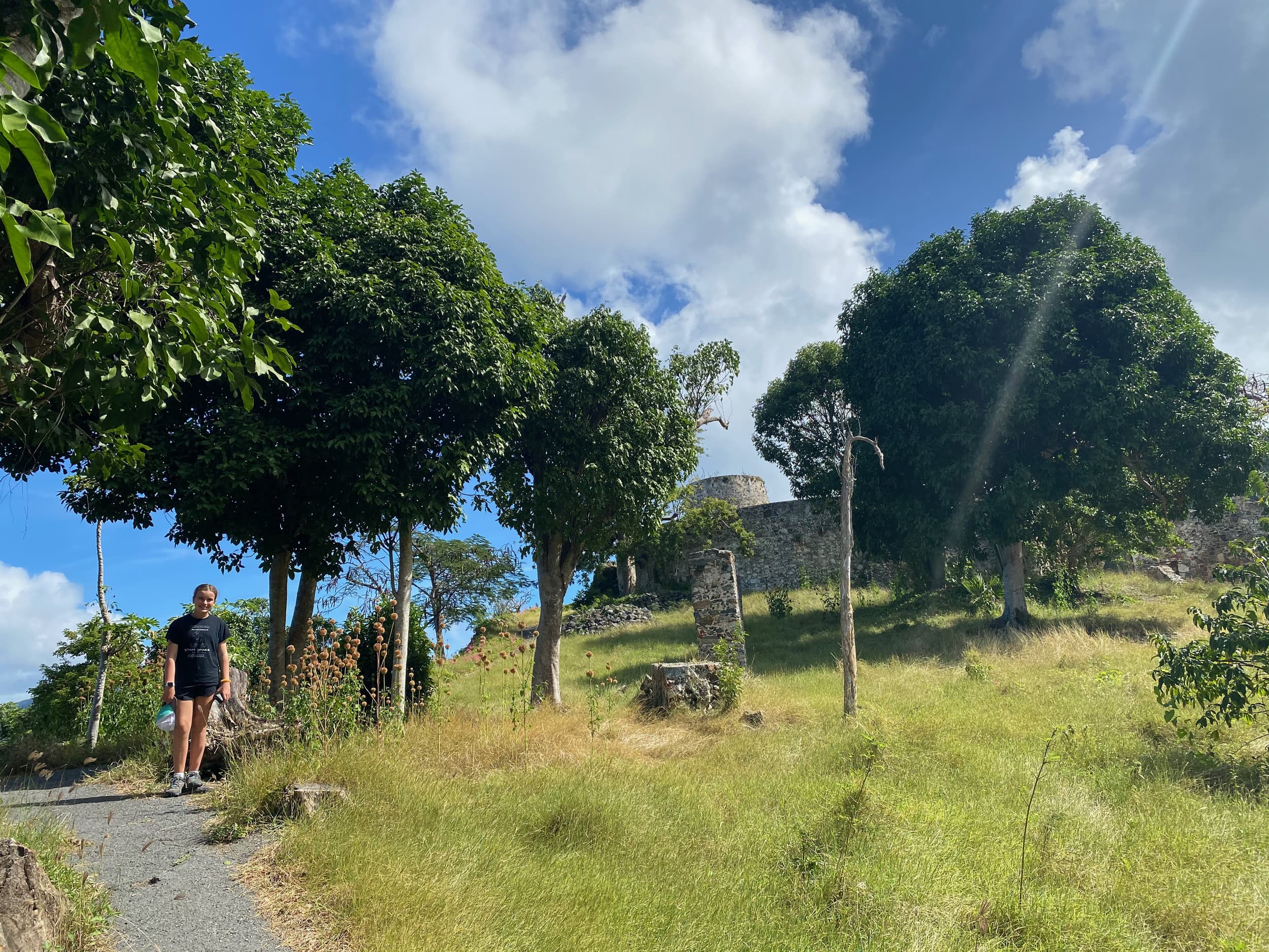 One of our first stops on our journey around the island after a few overlooks was the Annaberg Plantation, the historic ruins of a sugar mill from the 1800’s. In order to see the Plantation, we took a short hike up from the parking lot to a beautiful area overlooking the BVIs across the water. At the top, we swooned, seeing the lush foliage, crystal clear blue water, and trees swarmed with butterflies. It was spectacular!